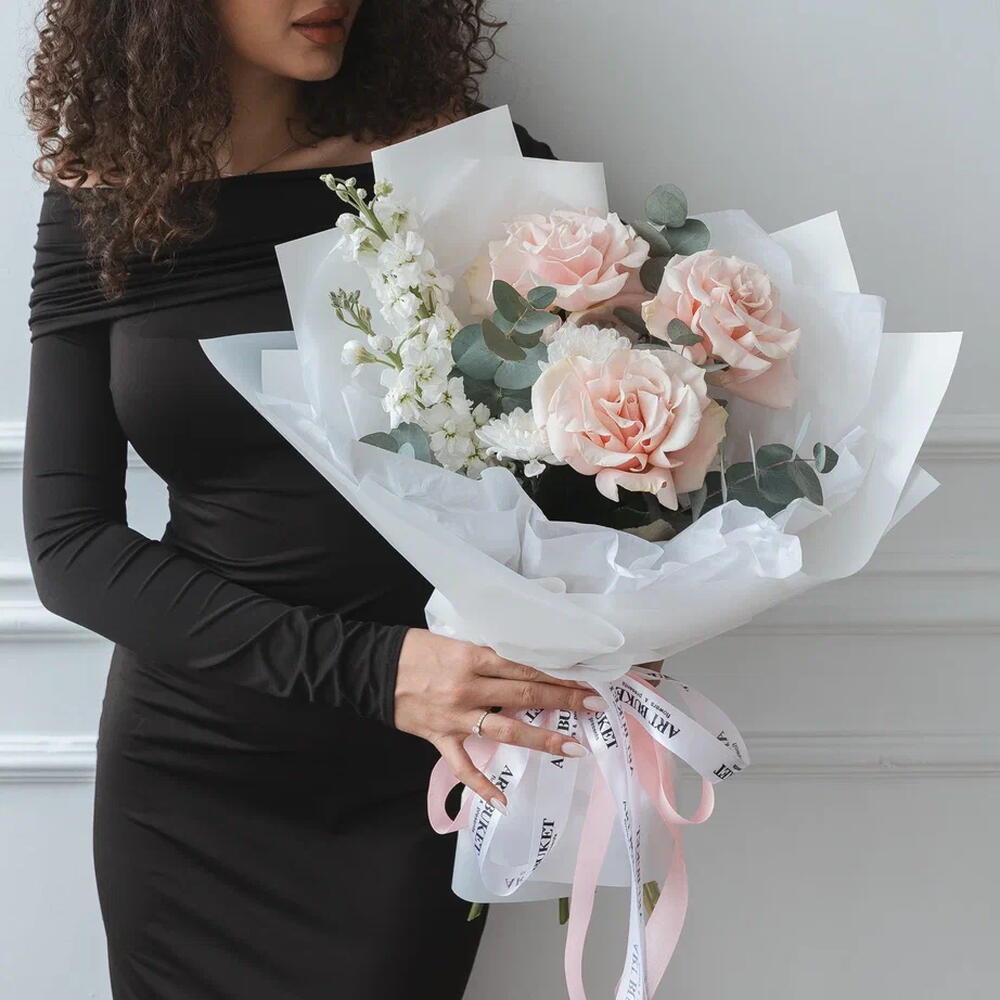 Маттиола - 2 шт. Эвкалипт - 1 шт. Хризантема Зембла белая - 1 шт. роза "пинк мондиаль" - 3 шт.