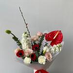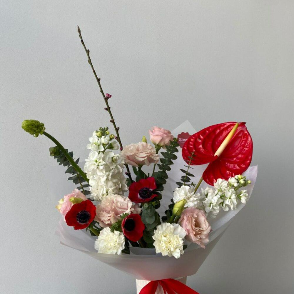 Анемон - 3 шт. Антуриум - 1 шт. Маттиола - 2 шт. Эвкалипт - 1 шт. Гвоздика - 2 шт. Эустома - 2 шт. Орнитогалум - 1 шт. ветка вербы - 1 шт.