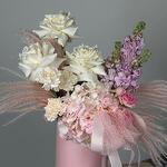 Гортензия - 1 шт. Маттиола - 3 шт. Диантус - 3 шт. Шляпная коробка - 1 шт. Французская роза - 3 шт. Ковыль - 4 шт. классическая кустовая роза - 3 шт.