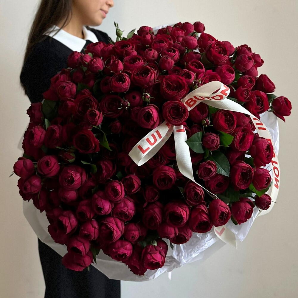 Букет 9из 55 веток кустовых роз сорта Red Piano — классика страсти и роскоши. Глубокий бархатный оттенок лепестков, пышные бутоны и насыщенный аромат делают этот букет символом искренних чувств