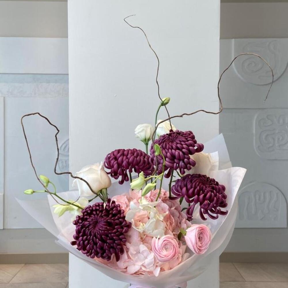 Гортензия - 1 шт. Эустома - 2 шт. Ранункулюс - 2 шт. Пионовидная роза - 1 шт. орхидея - 1 шт. Хризантема одноголовая - 4 шт. Салекс - 1 шт.