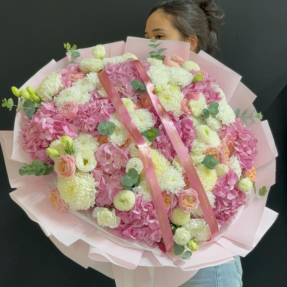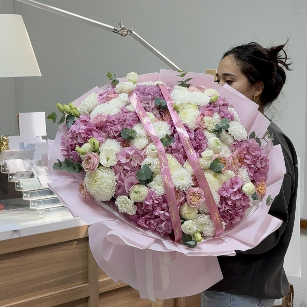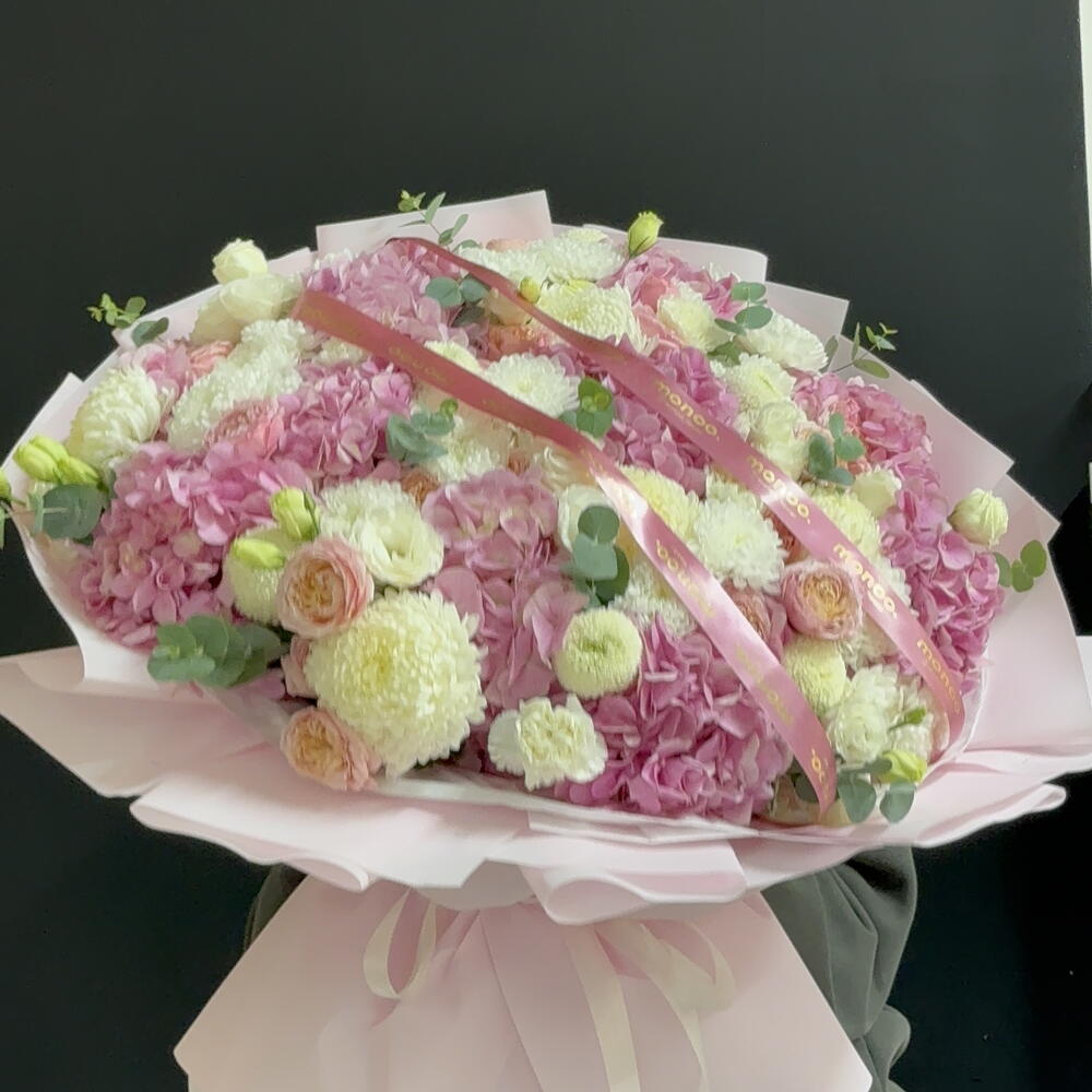 Гортензия - 10 шт. Лизиантус - 7 шт. Хризантема кустовая - 6 шт. Гвоздика - 6 шт. Хризантема одноголовая - 6 шт. Эвкалипт Цинерея - 13 шт. джульетта роза пионовидная - 7 шт. момоко - 7 шт.