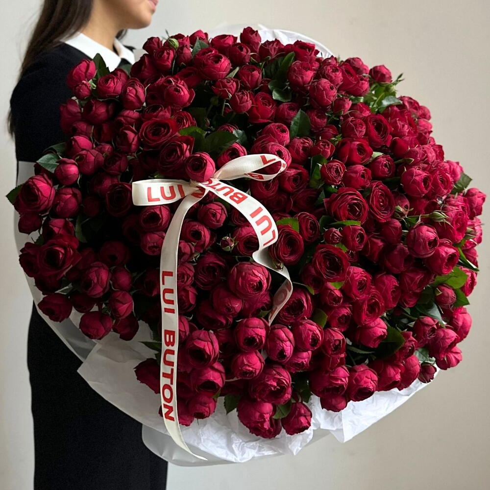 Букет из 75 веток кустовых роз сорта Red Piano — классика страсти и роскоши. Глубокий бархатный оттенок лепестков, пышные бутоны и насыщенный аромат делают этот букет символом искренних чувств
