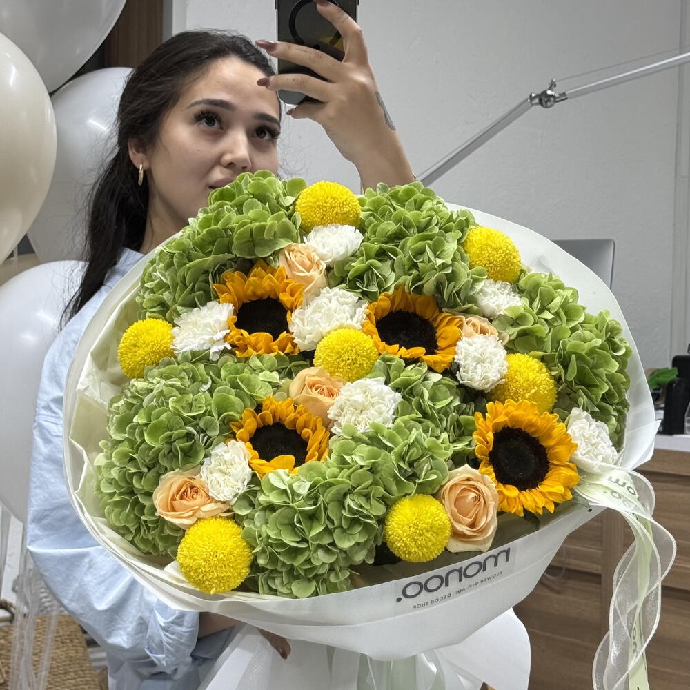 Гортензия - 6 шт. Гвоздика - 8 шт. Подсолнух - 4 шт. момоко - 7 шт. розы - 4 шт.