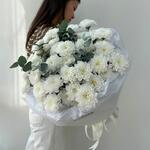 Букет из хризантем с эвкалиптом не оставит равнодушным. Он захватывает внимание и навсегда остаётся в памяти