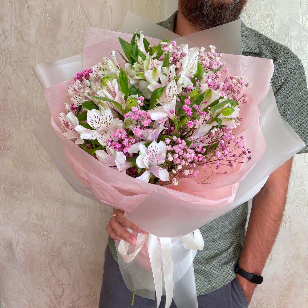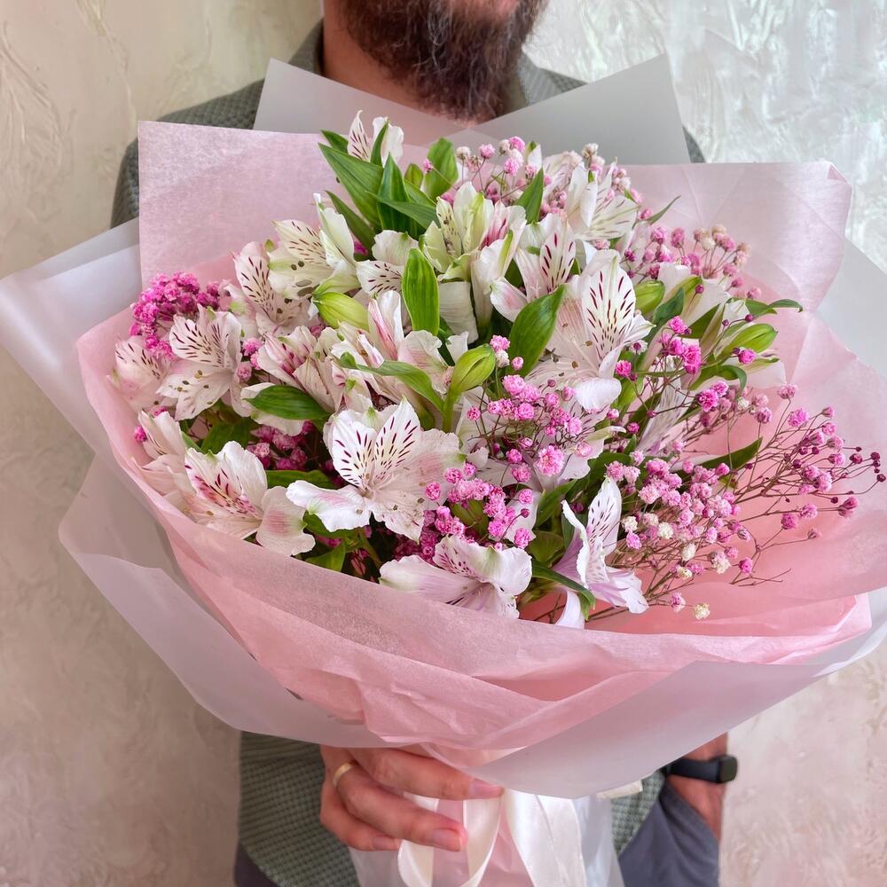 Альстромерия - 7 шт. Гипсофила - 3 шт. Лента атласная - 1 шт.