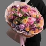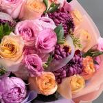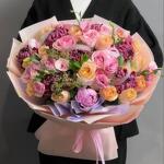 Вибурнум - 4 шт. Одноголовая хризантема - 7 шт. роза микс - 15 шт. пионы - 3 шт. пионовидные розы - 8 шт. лизиантусы - 10 шт.