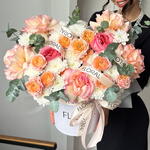 Хризантема кустовая - 3 шт. Эвкалипт - 1 шт. Пионовидная роза - 2 шт. Спрей роза - 3 шт. французские розы - 5 шт.