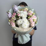 Маттиола - 2 шт. Хризантема кустовая - 2 шт. Кустовая роза - 1 шт. Эустома - 5 шт.