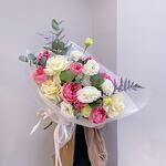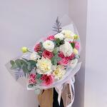 Эвкалипт - 1 шт. Диантус - 3 шт. пионовидные розы - 5 шт. ледер - 2 шт. вывернутые розы - 3 шт. эустомы - 2 шт.