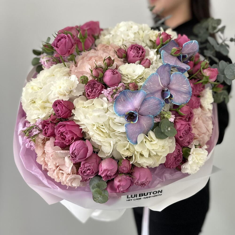 Гортензия - 7 шт. Маттиола - 3 шт. Эвкалипт - 2 шт. орхидея - 3 шт. кустовые пионовидные розы - 8 шт.
