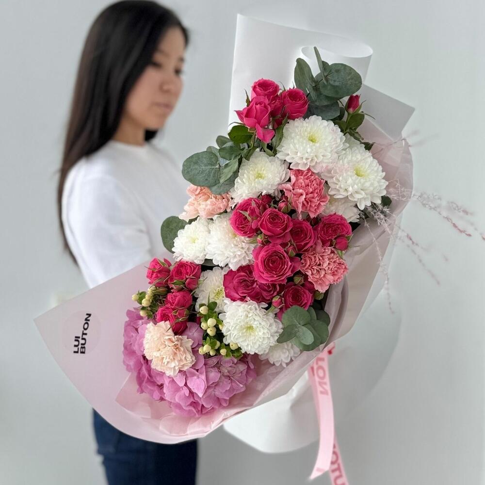 Элегантный букет из голландской гортензии, кустовых роз, хризантем, эвкалипта, гиперикума, диантусов и пионовидной розы — сочетание красоты и изысканности. Такой подарок точно оставит яркие впечатления