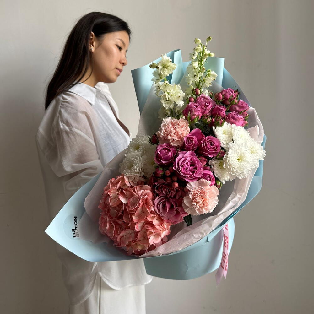 Гиперикум - 1 шт. Гортензия - 1 шт. Дельфиниум - 2 шт. Пионовидная роза - 1 шт. хризантемы - 2 шт. кустовые пионовидные розы - 2 шт.