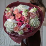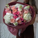 Гортензия - 3 шт. Маттиола - 5 шт. Кустовая пионовидная роза - 9 шт.