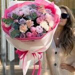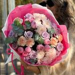 Хризантема кустовая - 2 шт. Эвкалипт - 3 шт. Кустовая роза - 3 шт. Диантус - 4 шт. розы - 11 шт.