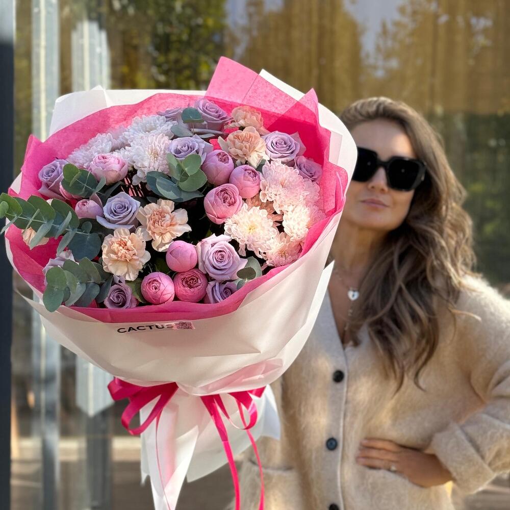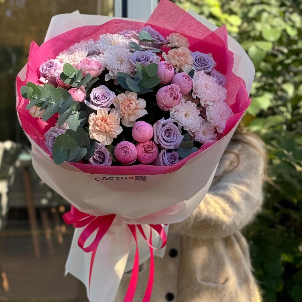 Хризантема кустовая - 2 шт. Эвкалипт - 3 шт. Кустовая роза - 3 шт. Диантус - 4 шт. розы - 11 шт.