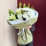 Букет из лилий, солидаго и хризантем с оформлением. Букет подчеркнёт вашу заботу и внимание, а также станет отличным дополнением к особому дню