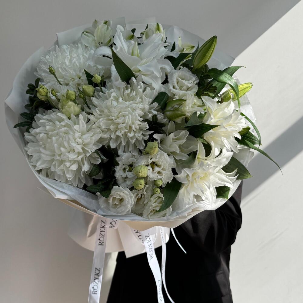 Альстромерия - 3 шт. Лилия - 3 шт. Эустома - 3 шт. Фисташка - 3 шт. Хризантема одноголовая - 3 шт. Упаковка дизайнерская - 10 шт.