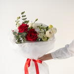Илекс - 1 шт. Маттиола - 1 шт. Фрезия - 1 шт. Эустома - 2 шт. Кустовая белая роза - 2 шт. Эвкалипт Baby Blue - 2 шт. Роза наоми 50 см - 3 шт.