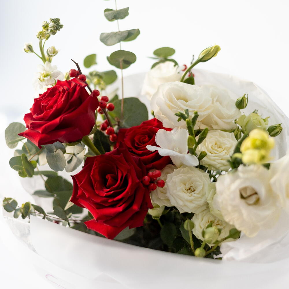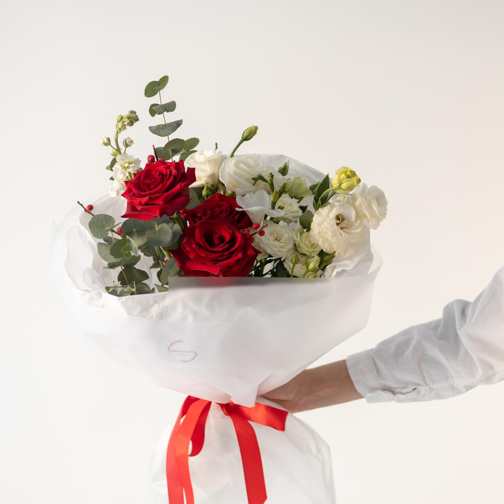 Илекс - 1 шт. Маттиола - 1 шт. Фрезия - 1 шт. Эустома - 2 шт. Кустовая белая роза - 2 шт. Эвкалипт Baby Blue - 2 шт. Роза наоми 50 см - 3 шт.