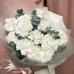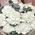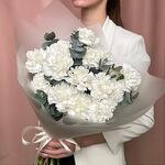 Этот элегантный букет сочетает в себе нежные цветы диантуса и ароматный эвкалипт. Он упакован в стильную дизайнерскую упаковку и украшен атласной лентой, что делает его отличным подарком для любого повода.