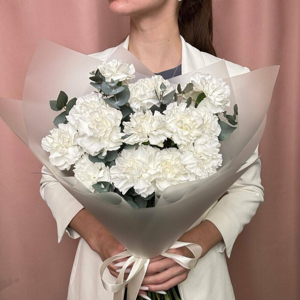 Эвкалипт - 3 шт. Лента атласная - 2 шт. Диантус - 15 шт. Дизайнерская упаковка - 6 шт.