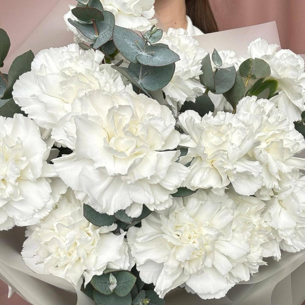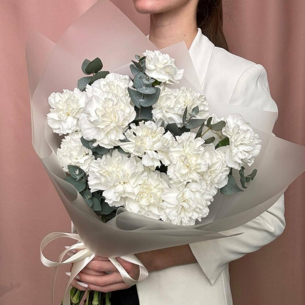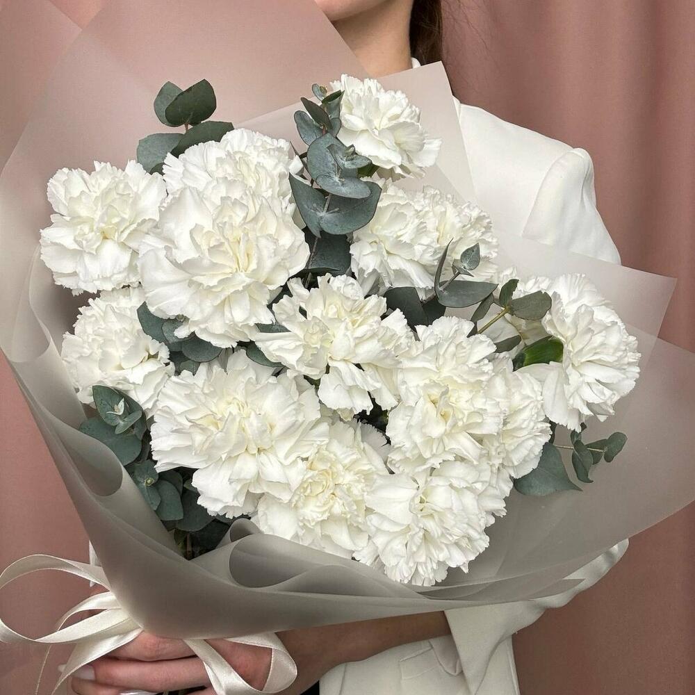 Этот элегантный букет сочетает в себе нежные цветы диантуса и ароматный эвкалипт. Он упакован в стильную дизайнерскую упаковку и украшен атласной лентой, что делает его отличным подарком для любого повода.