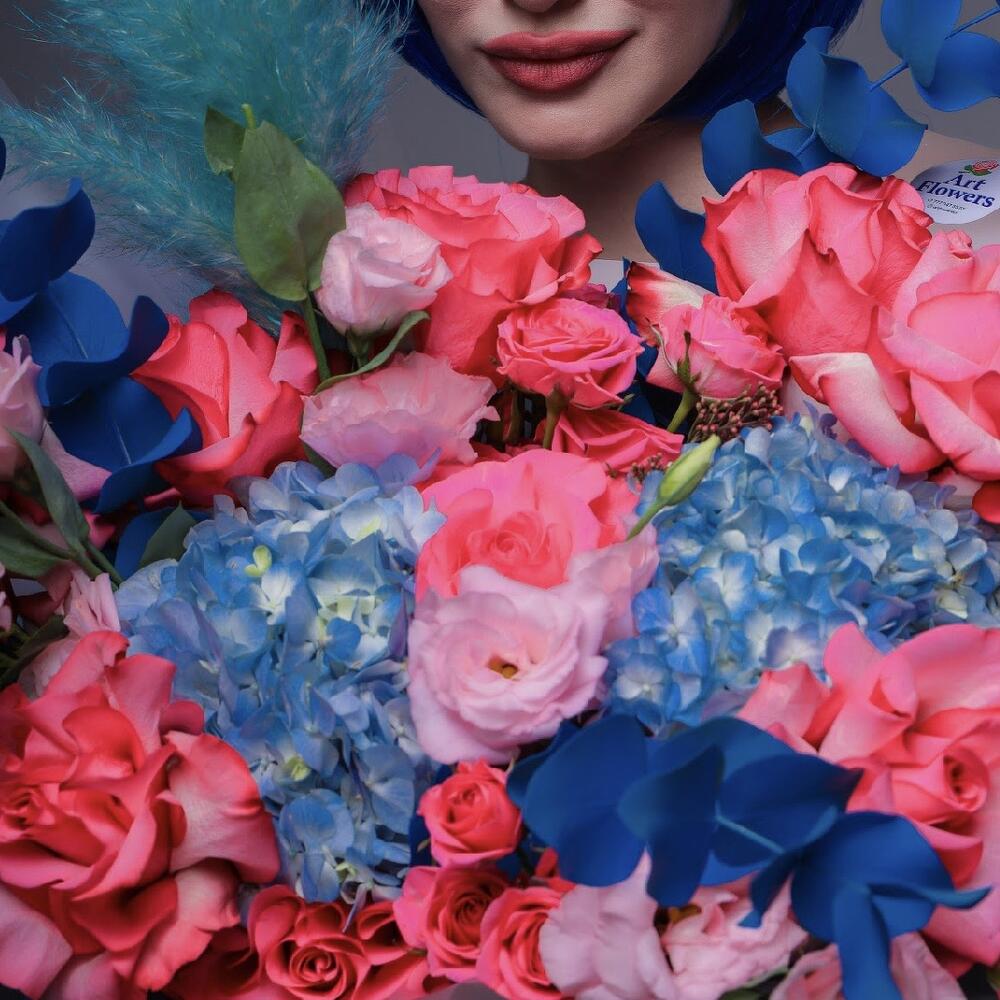 Эвкалипт - 5 шт. Гортензия голубая - 3 шт. розы - 11 шт. кустовые розы - 4 шт. лизиантусы - 4 шт. пампасы - 2 шт. аква бумага - 1 шт.
