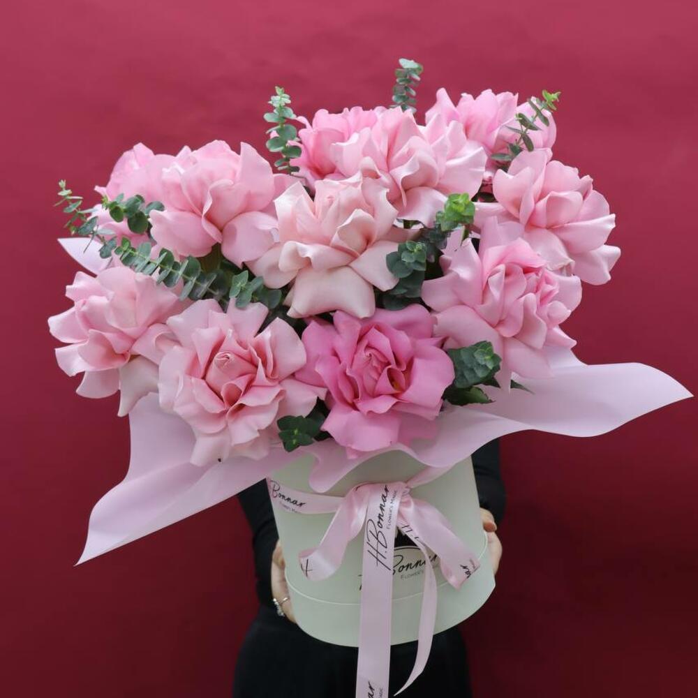 Эвкалипт - 1 шт. Коробка - 1 шт. розы - 11 шт.