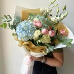 Гортензия - 1 шт. Лизиантус - 2 шт. Эвкалипт - 1 шт. розы - 2 шт. пионовидная спрей роза - 2 шт.