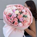 Гортензия - 2 шт. Пион - 3 шт. Эвкалипт - 2 шт. Гвоздика - 5 шт. Спрей роза - 5 шт. роза микс - 15 шт.