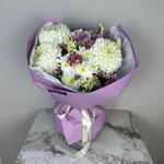 Лента атласная - 1 шт. Брассика - 1 шт. Хризантема кустовая Микс - 2 шт. статица ветка - 2 шт. упаковка тишью и пленка - 4 шт. ваксфлауэр ветка - 2 шт. хризантема одноголовая мишки - 3 шт.