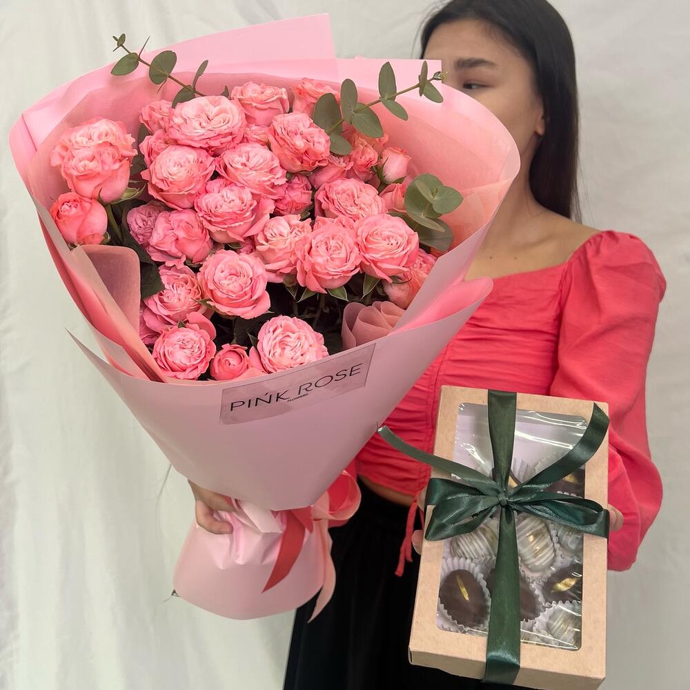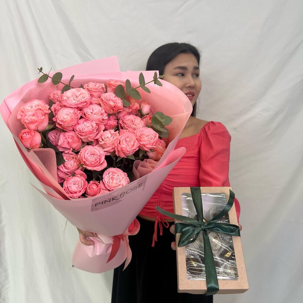 Букет из пионовидных роз Bombastic + королевские финики в бельгийском шоколаде украсят стол вашего получателя ☺️
