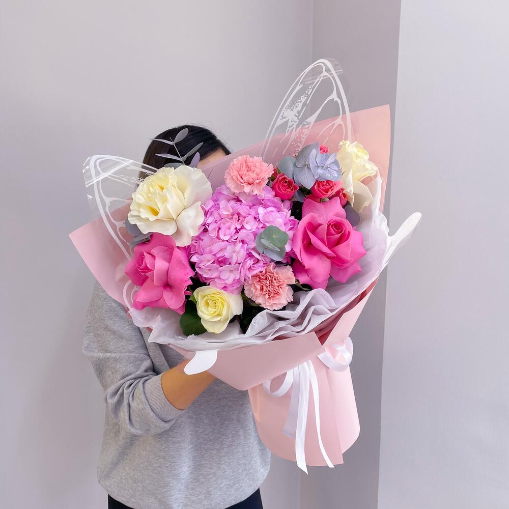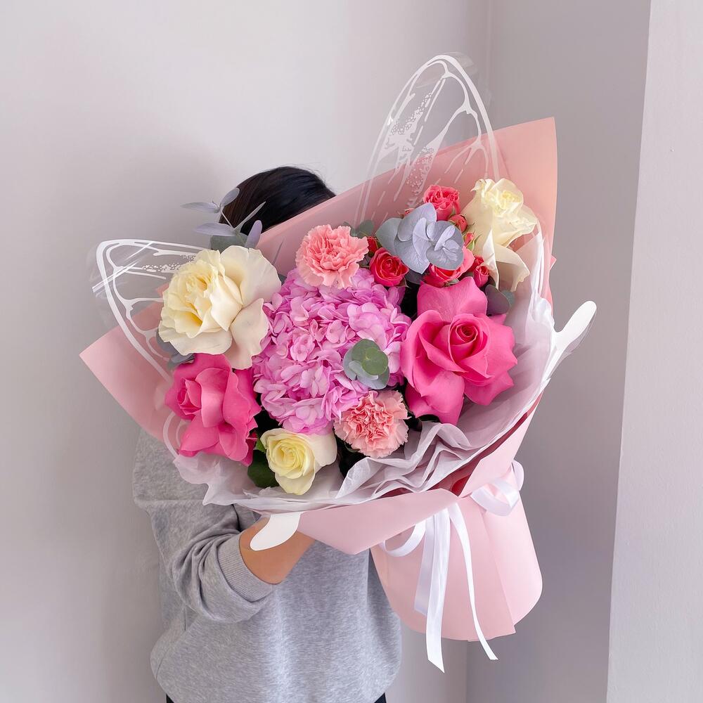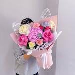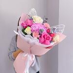 Гортензия - 1 шт. Эвкалипт - 1 шт. Диантус - 2 шт. Пионовидная кустовая роза - 1 шт. Голландская роза - 5 шт.