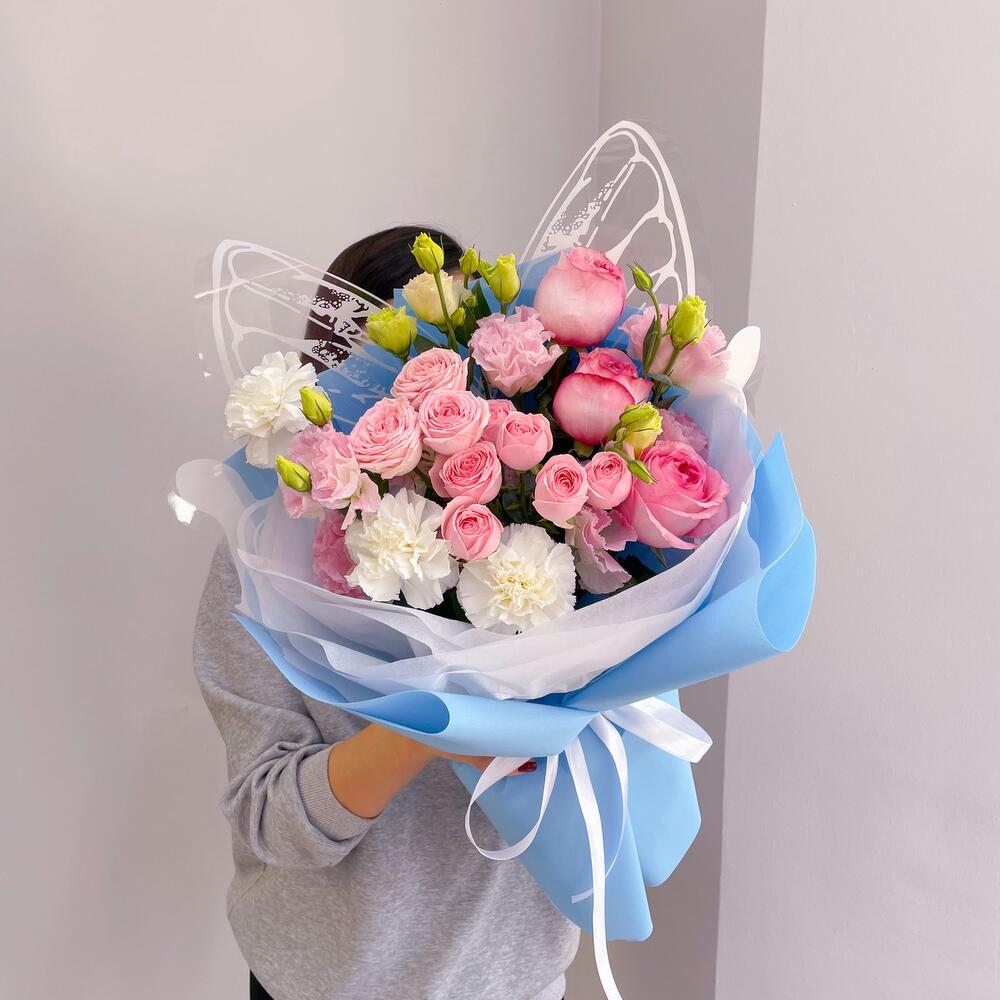 Гортензия - 1 шт. Эвкалипт - 1 шт. Кустовая роза - 2 шт. Диантус - 3 шт. Пионовидная роза - 3 шт. эустомы - 3 шт.