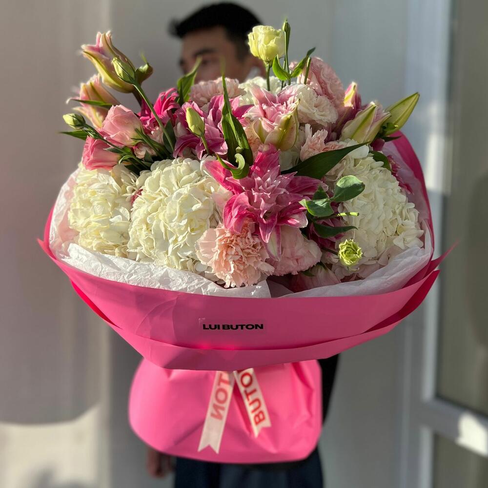 Гортензия - 5 шт. Диантус - 2 шт. лилии - 3 шт. эустомы - 3 шт.