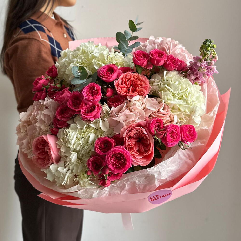 Маттиола - 1 шт. Эвкалипт - 1 шт. гортензии - 6 шт. пионовидные розы - 3 шт. кустовые розы - 6 шт.