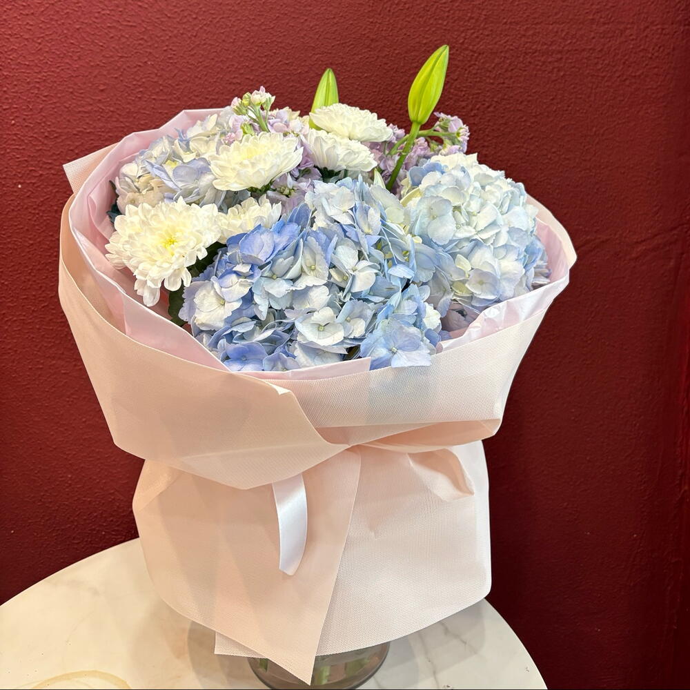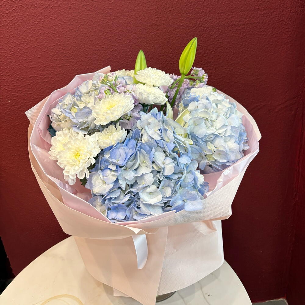 Гортензия - 3 шт. Лилия - 1 шт. Маттиола - 2 шт. Хризантема кустовая - 2 шт.