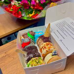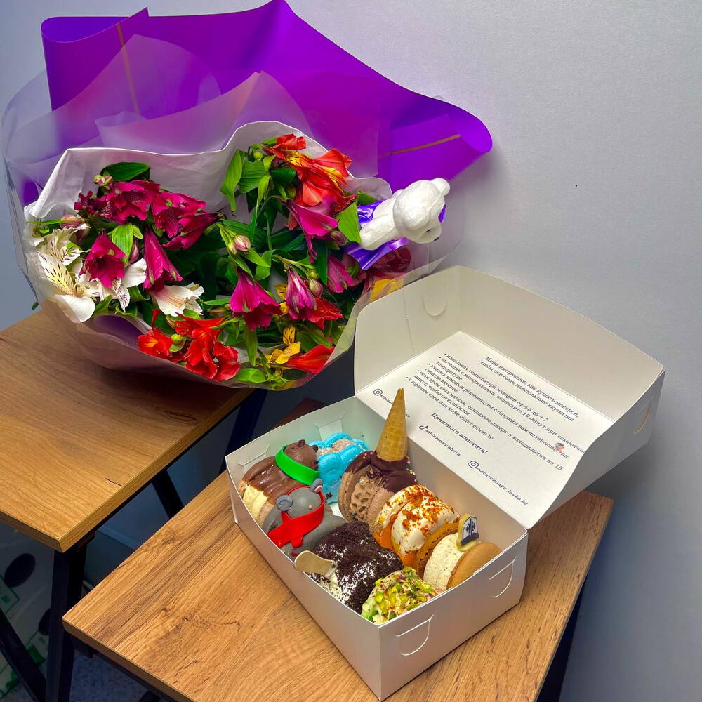 Букет цветов альстромерий и ассорти десертов(макаронс)для любимой