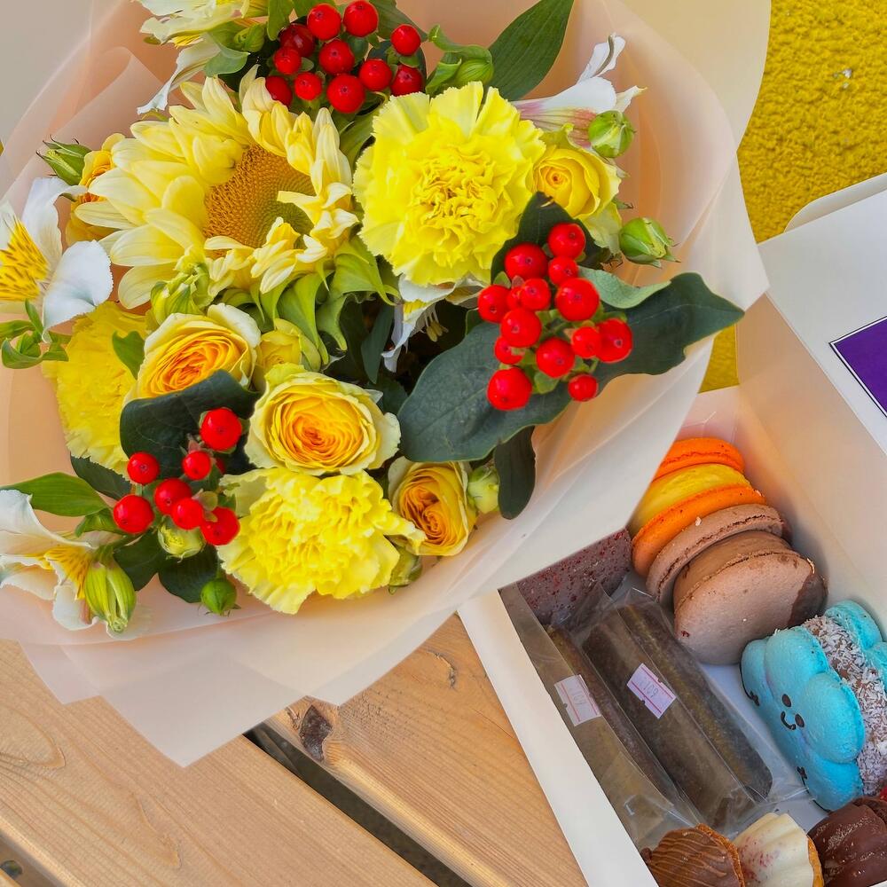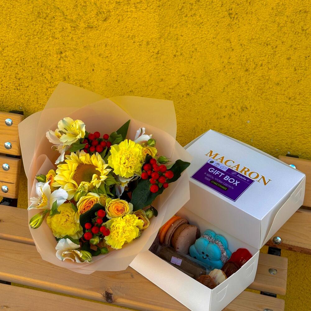 Флористическая композиция — нежный букет в жёлтых и белых тонах с акцентом на солнечные подсолнухи, розы, альстромерии и декоративные ягоды. Упакован в стильную матовую плёнку. Коробка сладостей — фирменный набор Macaron Gift Box с разнообразными десертами: макароны разных вкусов и цветов, фигурный голубой макарон в виде облака и другие лакомства. Такой набор сочетает в себе эстетику и вкус, создавая атмосферу праздника и заботы. Отличный вариант подарка для любого повода.
