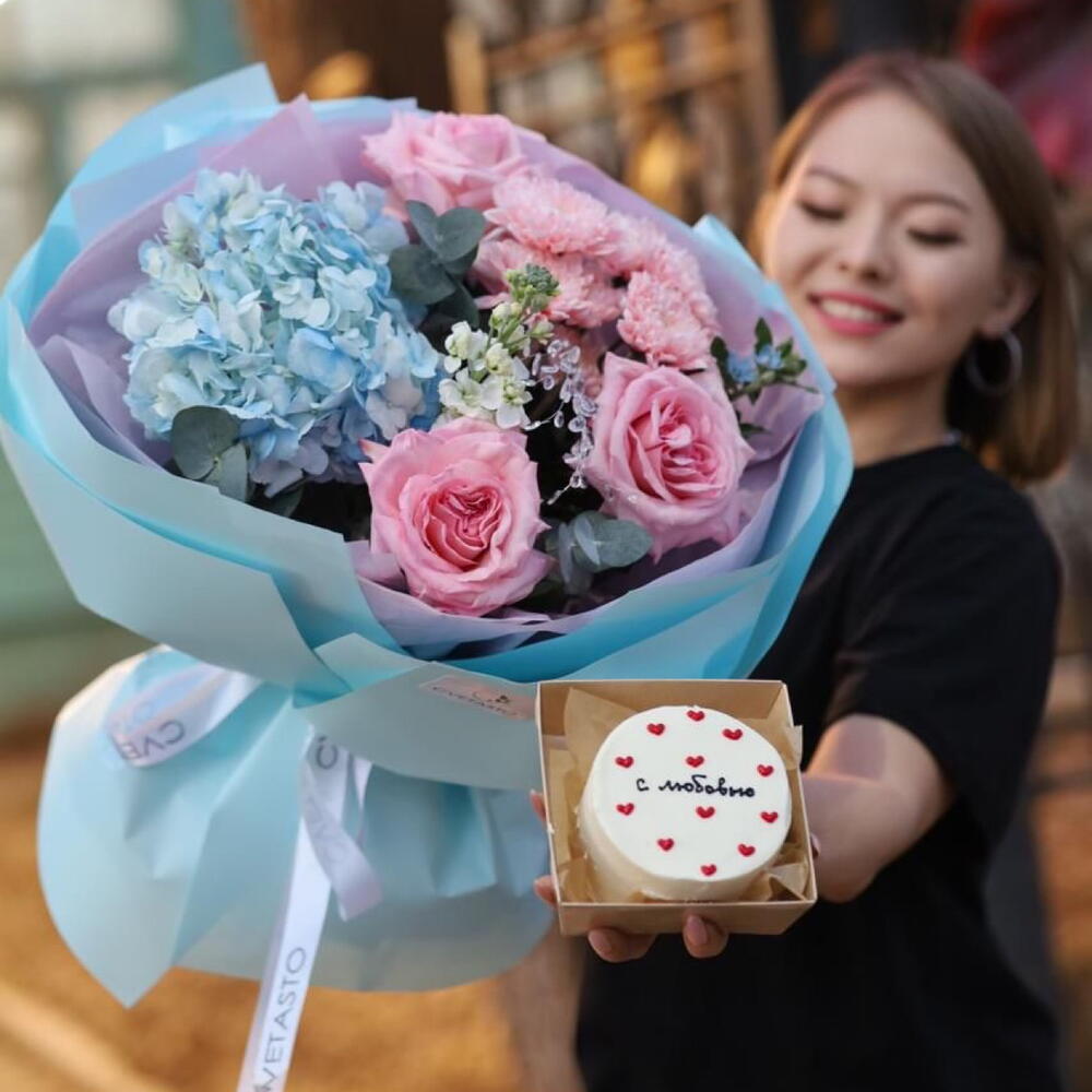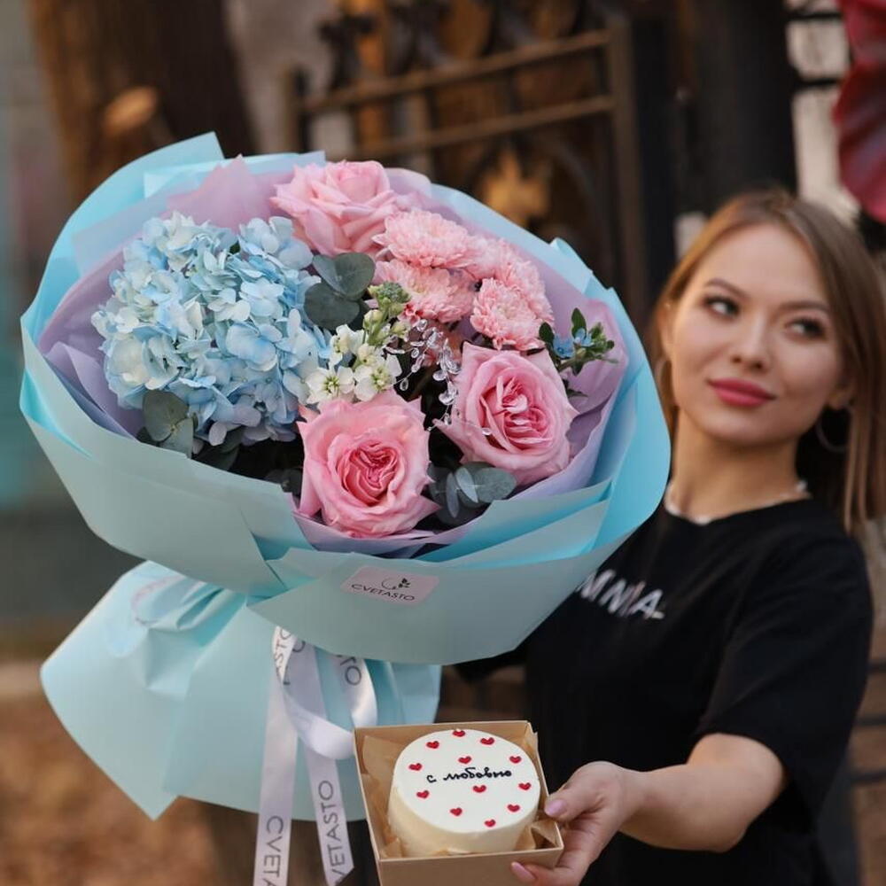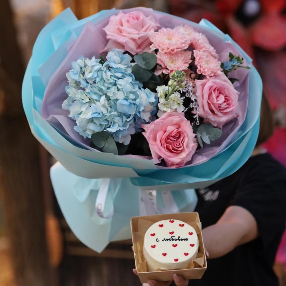Гортензия - 1 шт. Маттиола - 1 шт. Хризантема кустовая - 1 шт. Эвкалипт - 3 шт. Роза - 3 шт. Твидия - 1 шт.