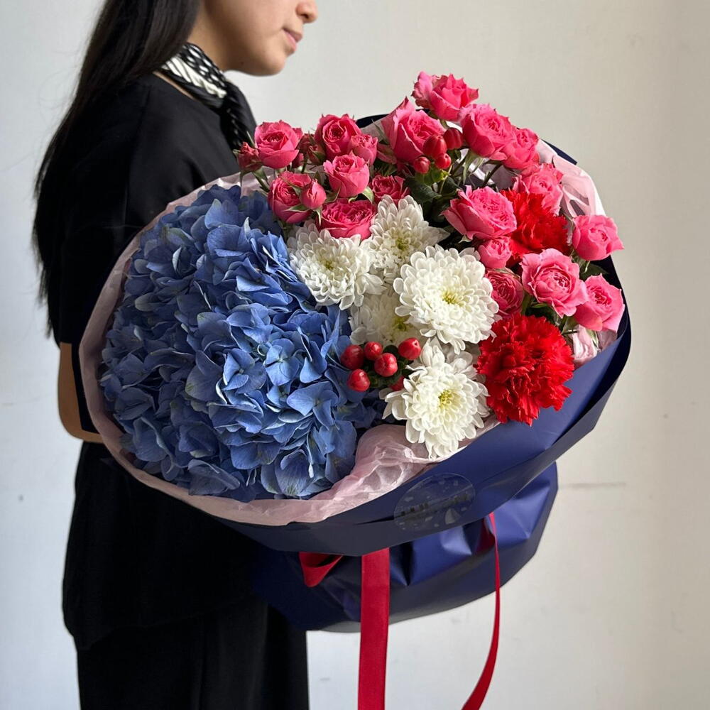 Гиперикум - 2 шт. Гортензия - 1 шт. Хризантема - 2 шт. Диантус - 2 шт. кустовые розы - 4 шт.