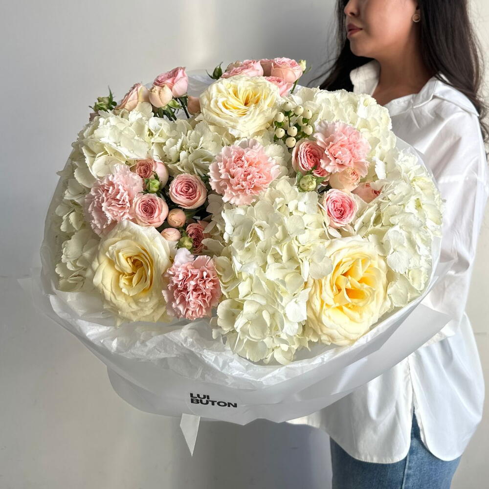 Гиперикум - 1 шт. Диантус - 4 шт. гортензии - 5 шт. пионовидные розы - 3 шт. кустовые розы - 5 шт.