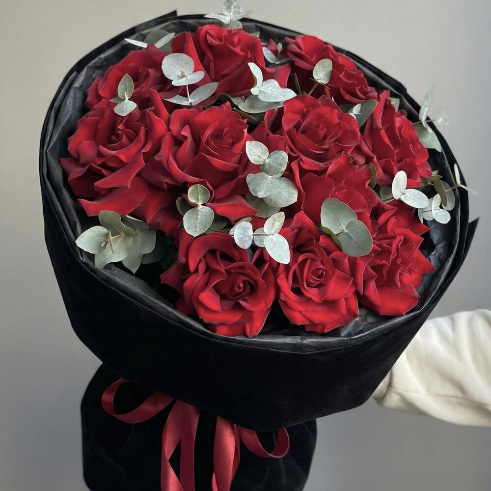 Лента атласная - 1 шт. Роза Эквадор 60 см - 11 шт. Эвкалипт Цинерея - 2 шт. Фоамиран (упаковка) - 2 шт.