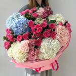 Гортензия - 7 шт. Маттиола - 1 шт. Озотамнус - 1 шт. Эустома - 1 шт. кустовые розы - 7 шт.