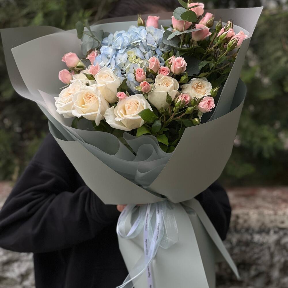 Гортензия - 1 шт. Роза - 7 шт. Кустовая роза - 3 шт. Дизайнерское оформление - 1 шт.