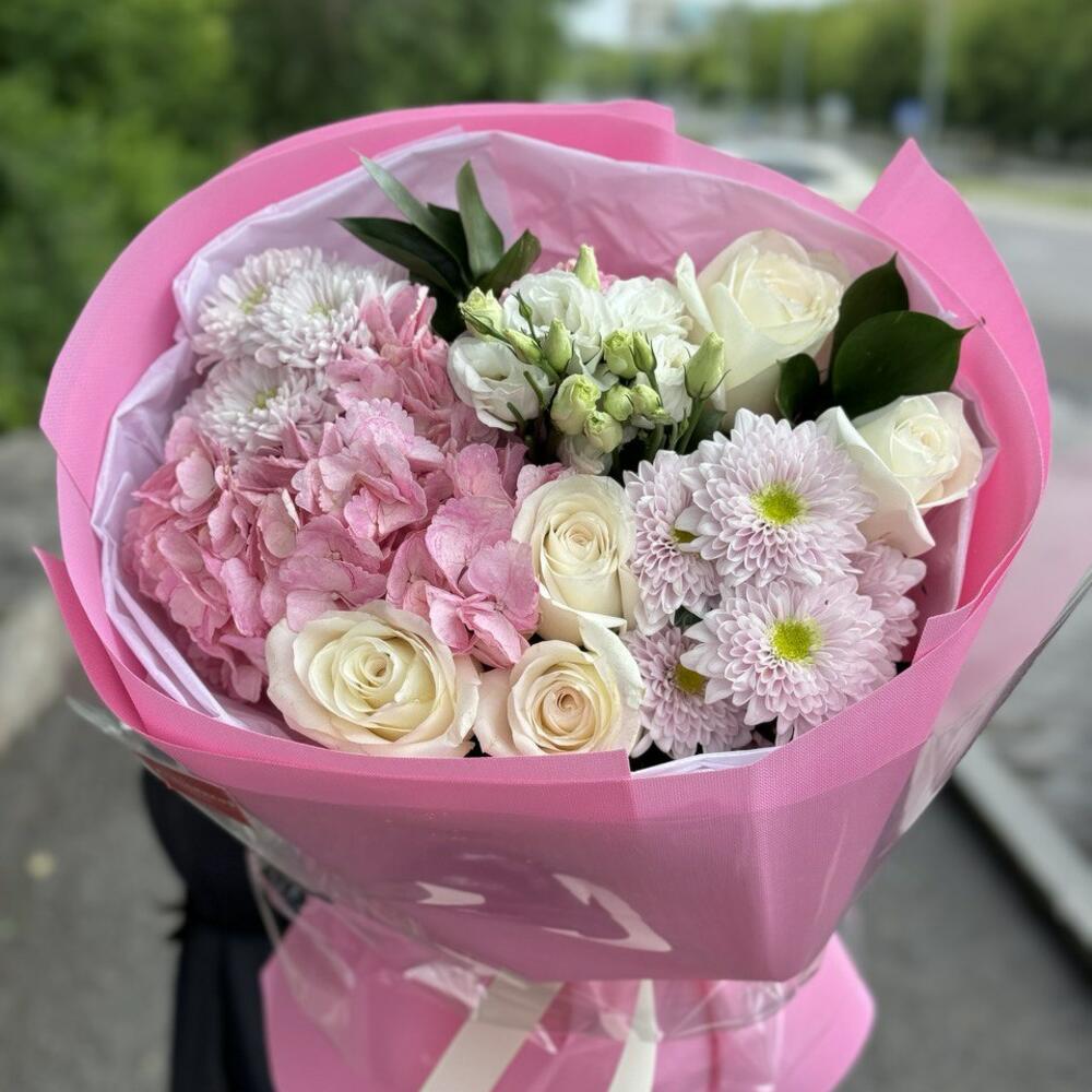 Гортензия - 1 шт. Рускус - 2 шт. Кустовая хризантема - 2 шт. Эустома - 1 шт. розы - 5 шт.
