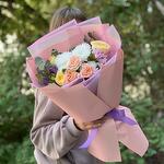 Альстромерия - 2 шт. Эвкалипт - 1 шт. Роза - 3 шт. Кустовая хризантема - 1 шт. Пионовидная кустовая роза - 1 шт. Дизайнерское оформление - 1 шт.