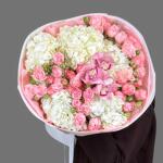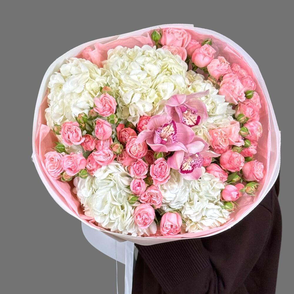 Гортензия - 5 шт. Кустовая роза - 10 шт. ЦИМБИДИУМ - 3 шт. аква бумага - 1 шт.