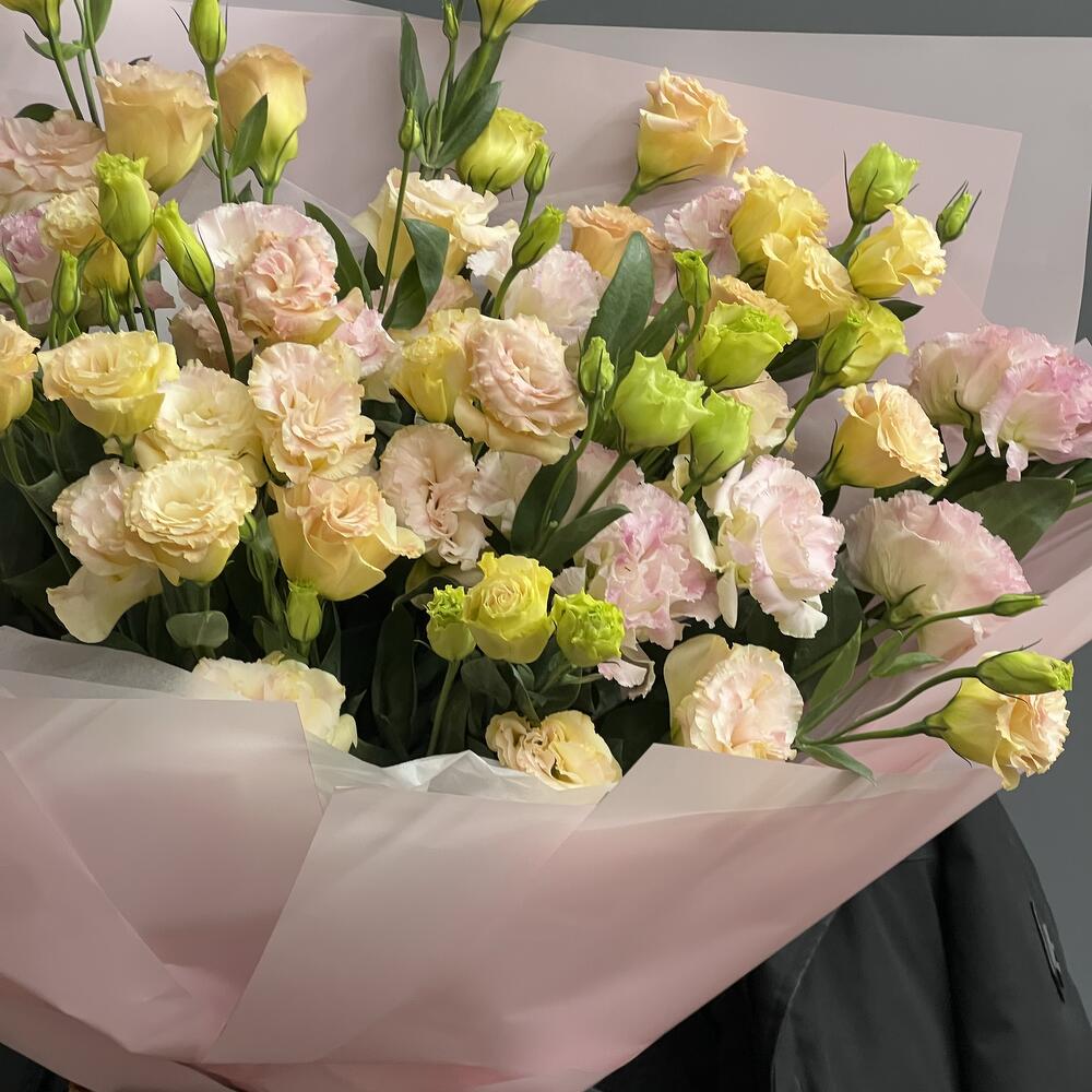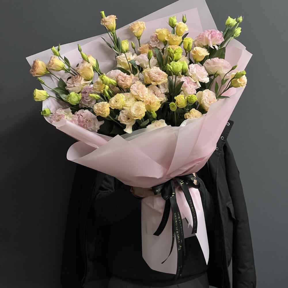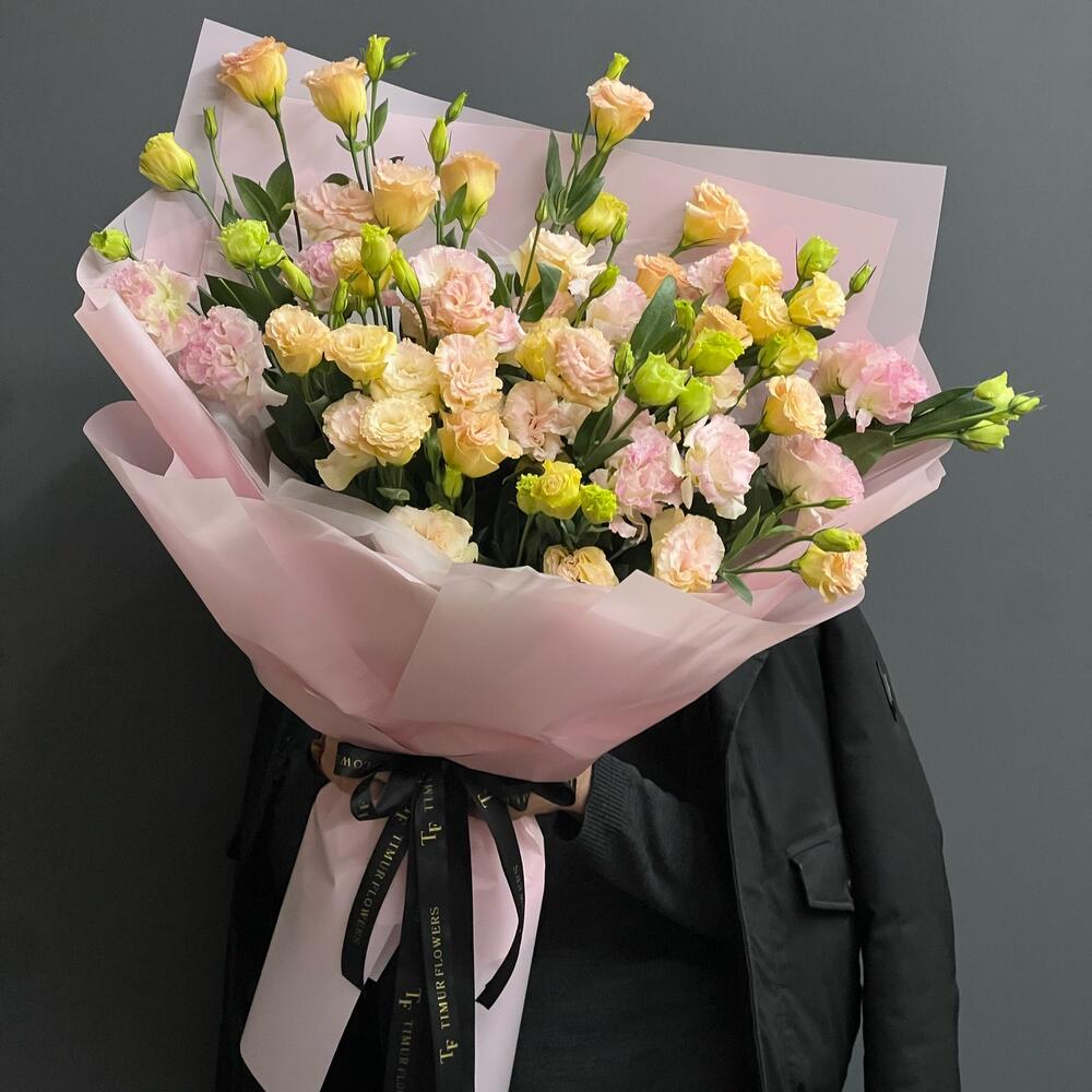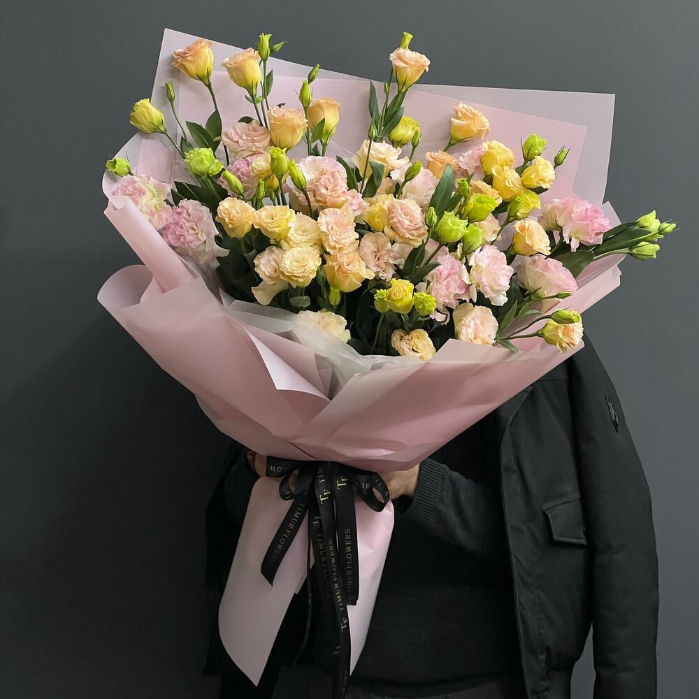 Эустома - 21 шт. Тишью - 3 шт. лента рапсовая - 3 шт. матовая салфетка - 7 шт.
